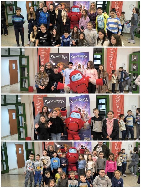 12. prosinca posjetio nas je Superknjiga tim s Gizmom (likom koji se pojavljuje u biblijskim crtićima). SUPERKNJIGA je moderna, sinkronizirana animacija najljepših biblijskih priča, koju su od 2016. godine prikazivale i nacionalne televizije: RTL, Nova TV i Laudato televizija. Zbog svoje popularnosti među najmlađima, ali i sveobuhvatnog sadržaja, koristi se i kao dodatni materijal u vjeronaučnom kurikulumu osnovnih škola pa je i sam susret organizirala vjeroučiteljica Paula Vukčević. Pjesma, ples, smijeh, zvukovi crtića Prvi Božić u potpunosti su razdragali djecu, ali i učitelje i ostale djelatnike naše škole. Kad se pojavio i sam Gizmo, oduševljenju nije bilo kraja. Svi su se željeli s njim fotografirati, dotaknuti ga, dati mu “četiri” jer Gizmo ima 4 prsta.
